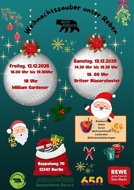 Die Britzer WeinKultur lädt Groß und Klein auch in diesem Jahr zum Weihnachtszauber unter Reben ein. Wenn die Rebreihen festlich erleuchten und weihnachtliche Düfte sich über das Gelände verbreiten, dann stimmen wir auf das bevorstehende Weihnachtsfest ein. Mit William Gardener am Freitag und dem Britzer Blasorchester am Samstag werden wir musikalisch begleitet und: Mitsingen erwünscht! In der Winzerstube gibt es wieder Kunst und Kalender von der Künstlerin Silke Konschak. Und ganz wichtig: Für die Kleinen kommt der Weihnachtsmann!